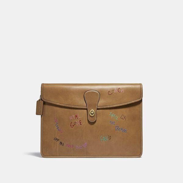 Description: Wear it, love it, pass it on. This style is part of Coach Forever, a collection inspired by our commitment to rethinking and reducing our impact on the planet. This streamlined portfolio keeps documents and small necessities organized with an outside magnetic snap pocket, inside zip pocket and space for a tablet. Crafted of original natural leather specially treated with responsibly sourced dyes and organic wax for a soft touch, it’s embroidered with playful sayings, positive thoughts and Coach icons.