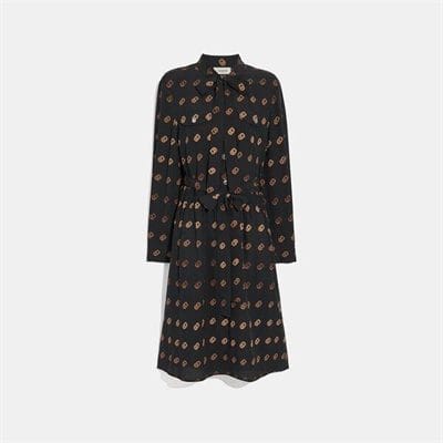 Description: Instantly change your look with our lightweight silk shirt dress by wearing the long neck tie undone, as a relaxed knot or a voluminous bow. Featuring a bold retro-inspired C print, the A-line style is finished with subtle ruching at the waist and polished side snaps.