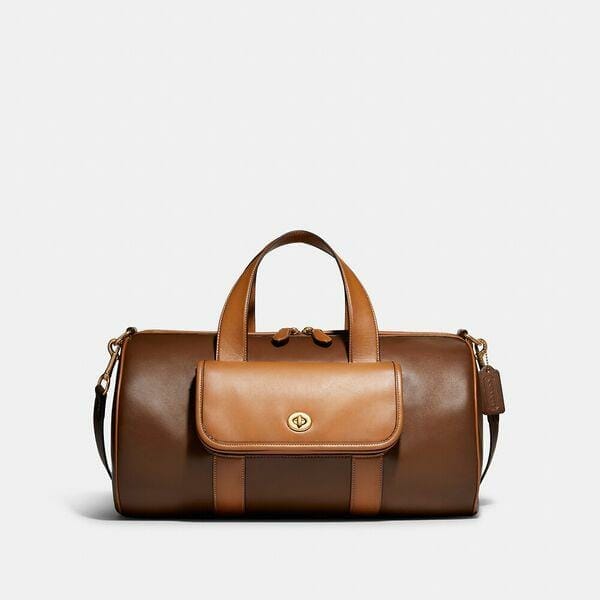 Description: A mashup of two legendary Coach designs, this spacious carryall features a Dinky bag as a convenient front pocket on our sporty Duffle. Crafted of our buttery soft glovetanned leather, it’s finished with a detachable strap to wear on the shoulder or crossbody.