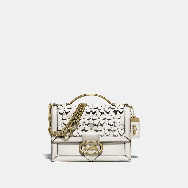 Description: Based on a Coach favorite introduced in the 1970s, the Riley is a slender design perfect for nights out and days on the go. Featuring our dimensional floral appliqués, this glovetanned leather silhouette features a ladylike top handle, three expandable interior compartments and a detachable crossbody strap. The iconic Coach Horse and Carriage, which was first introduced in the 1950s, accents the snap closure.