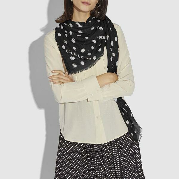 Description: This lightweight scarf features a modern graphic floral print set against our Signature. Finished with delicate fringe trim, wear it as a scarf or graphic shawl.