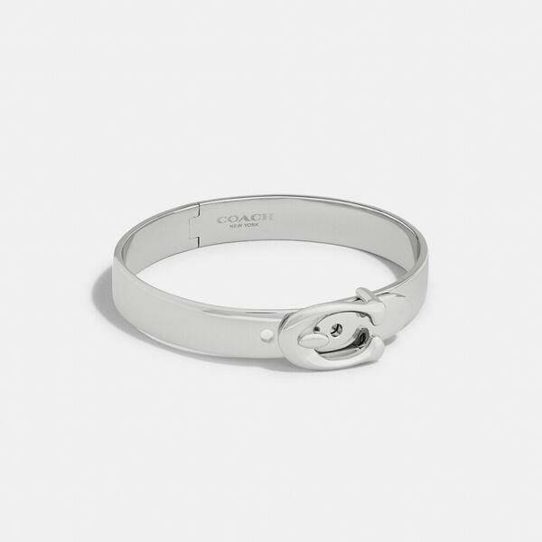 Description: This plated brass and enamel bangle is finished with our Signature buckle for iconic Coach style. Wear it alone or stack with other bracelets.