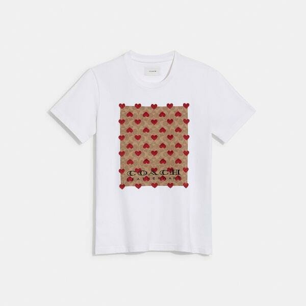 Description: A lot to love. Crafted of certified organic cotton made without the use of harmful chemical fertilizers and pesticides, this T-shirt is part of Coach Forever, a collection inspired by our commitment to rethinking and reducing our impact on the planet. The classic-fit style features a playfully romantic heart print set against our Signature.