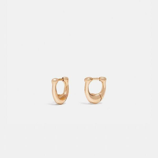 “These delicate hoops hug the earlobe for an elegant minimalist look. Perfect for every day, they feature our Signature for iconic Coach style.