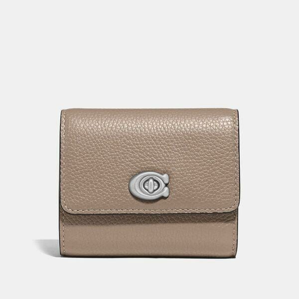 Polished pebble leather. Five credit card slots. Full-length bill compartment. Inside snap coin pocket. Turnlock closure. 10.5cm (L) x 9cm (H).