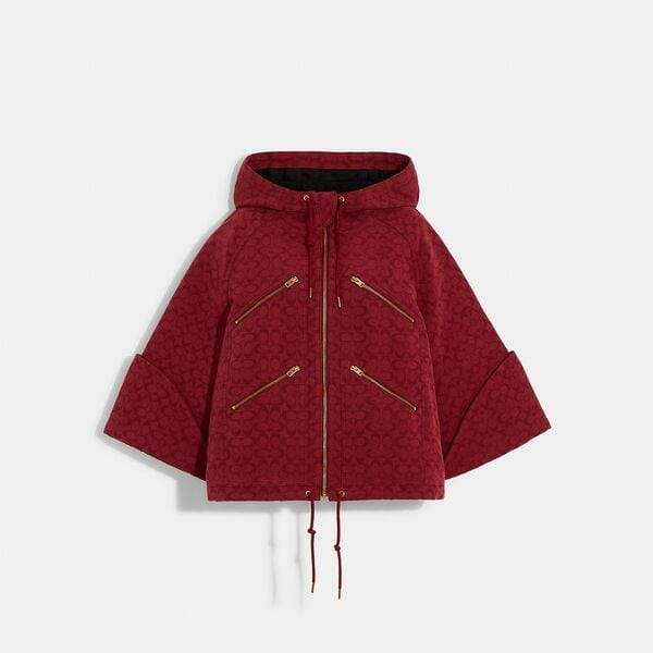 Description: Crafted of certified organic cotton made without the use of harmful chemical fertilizers and pesticides, this cape is part of Coach Forever, a collection inspired by our commitment to rethinking and reducing our impact on the planet. Perfect for layering, the zip-front topper features our allover Signature and is finished with an attached hood and multiple zip pockets for stashing essentials.