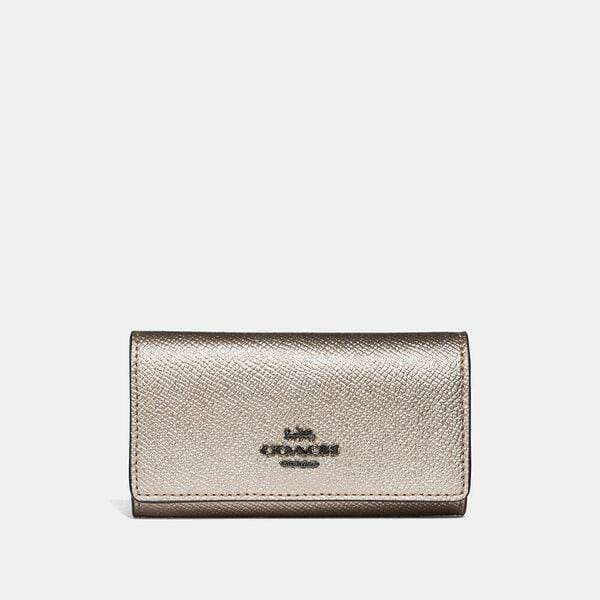 Description: This tri-fold key case safely stores keys where they won’t scratch or poke. Crafted in our scratch-resistant metallic crossgrain leather, it features six durable key hooks, a separate split key ring, and an adjustable snap closure.