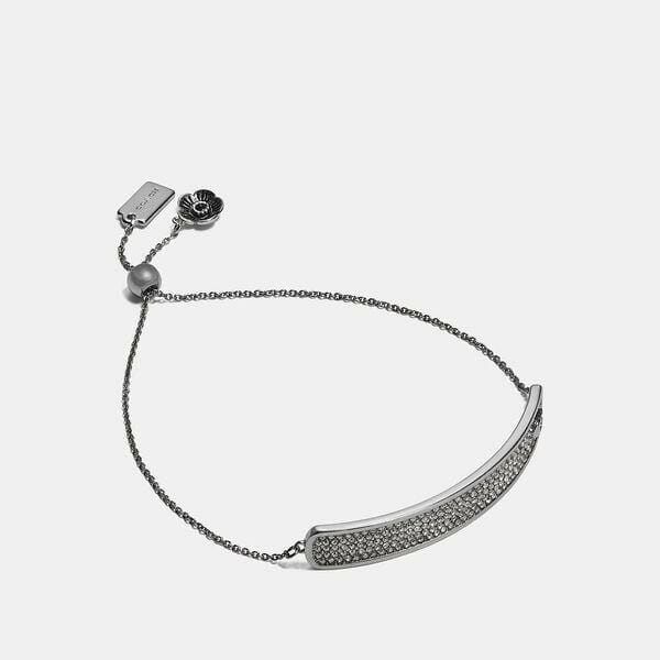 Description: Accented with our Signature, this sleek bracelet shimmers with sparkling crystals. Finished with a sliding bead closure that adjusts to most wrists, our diminutive hangtag and prairie-inspired Tea Rose add an iconic Coach touch.