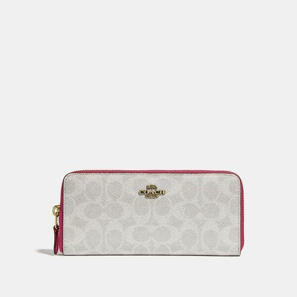Description: Signature coated canvas and refined calf leather. Eight credit card slots. Full-length bill compartments. Zip coin pocket. Zip-around closure. 19.5cm (L) x 9cm (H) x 2cm (W).