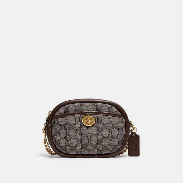 Description: Signature jacquard and glovetanned leather. One credit card slot. Inside multifunction pocket. Zip closure, leather lining. Outside turnlock pocket. Detachable strap with 54.5cm drop for shoulder or crossbody wear. 19.5cm (L) x 14.5cm (H) x 6.5cm (W).