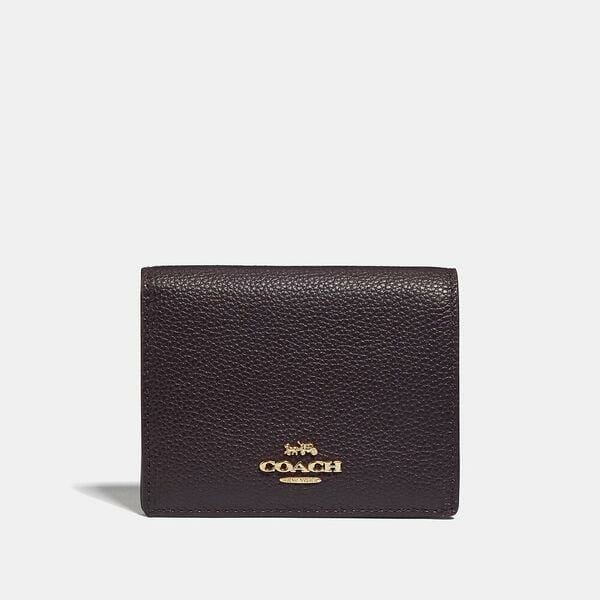 Description: Crafted of polished pebble leather, this small bifold wallet easily fits into a compact wristlet or crossbody bag. Secured by a snap closure, the petite design is perfectly organized to hold cards, cash and receipts.
