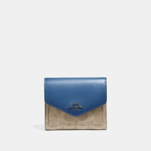 Description: This compact wallet is crafted in a mix of Signature canvas and smooth leather. Secured by a snap closure, the trifold design is perfectly organized to hold cards, cash and receipts.