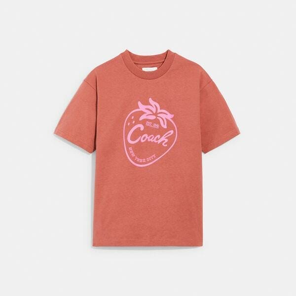 Description: Crafted of certified organic cotton made without the use of harmful chemical fertilizers and pesticides, this T-shirt is part of Coach Forever, a collection inspired by our commitment to rethinking and reducing our impact on the planet. Inspired by ’90s skate culture and New York City adolescent grunge, the relaxed-fit crewneck features a fresh strawberry graphic detailed with our name.