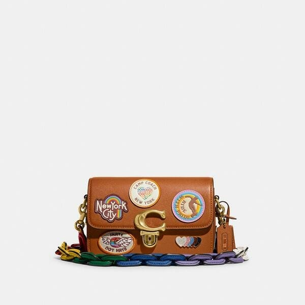 Description: This Studio Shoulder Bag 19 is part of the Coach Pride Collection, a celebration of equality, diversity, and authentic self-expression within the LGBTQIA+ community this month and every month. A timeless style that you’ll love (and wear) for years to come, Studio features our Signature push-lock closure, a modern take on an archival clasp born in our Coach Design Studio. The compact 19 is crafted of buttery soft glovetanned leather featuring playful patches inspired by skate culture and a rainbow-hued leather chain strap. Add the luxe interchangeable leather covered chain link strap to instantly change the look of the bag.