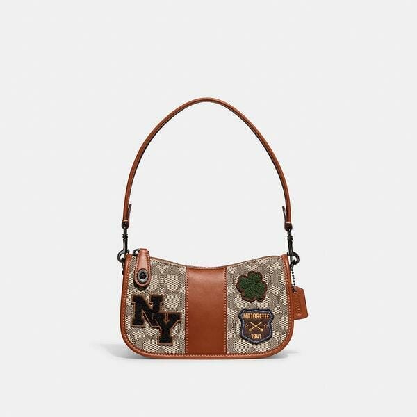 Description: The Swinger 20 is part of The Coach Originals, a collection of archival-inspired bags that celebrates our legacy and authentic New York heritage. Based on a 1980s Coach design reimagined for today, this streamlined style is crafted of glovetanned leather and our Signature Textile Jacquard, a blend of organic cotton and recycled polyester made from recycled plastic bottles-part of our commitment to rethinking and reducing our impact on the planet by repurposing waste materials. Featuring our iconic turnlock closure and playfully sporty Varsity patches, the petite bag sits just beneath the underarm with the short-strap or it can be carried as a clutch. Some styles are just too good to leave in the archives.