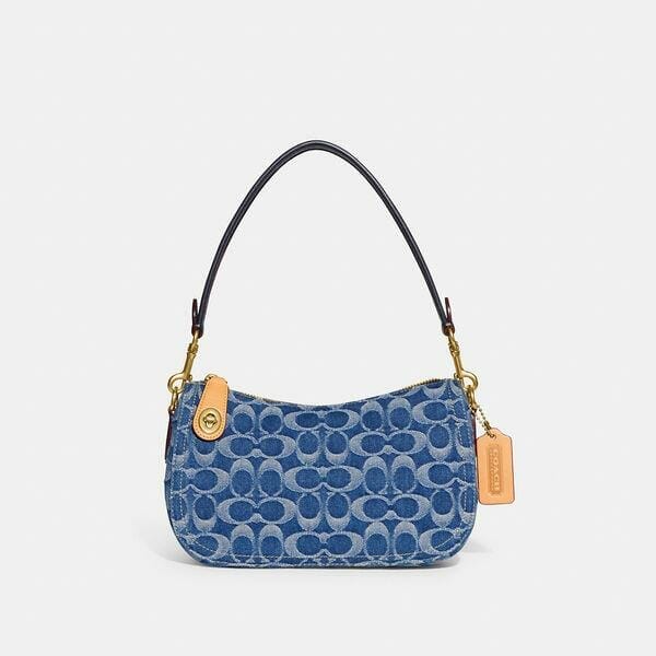 Description: The Swinger Bag is part of The Coach Originals, a collection of archival-inspired bags that celebrates our legacy and authentic New York heritage. Based on a 1980s Coach design reimagined for today, the zip-top short-strap shoulder bag sits just beneath the underarm for hands-free convenience, features our iconic turnlock closure and includes a detachable strap to wear crossbody. Inspired by our commitment to rethinking and reducing our impact on the planet, the streamlined Signature denim style is crafted of certified organic cotton made without the use of harmful chemical fertilizers and pesticides. Some styles are just too good to leave in the archives.