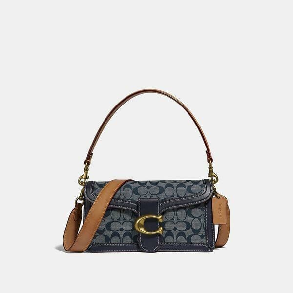 Description: A modern take on an archival 1970s Coach design, our structured Tabby shoulder bag is crafted in a mix of our lightweight Signature chambray and smooth leather. Finished with our Signature hardware for an iconic touch, the compact 26 features two detachable straps to carry by hand, style as a short shoulder bag or wear crossbody.