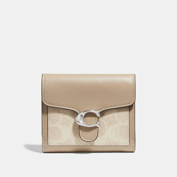 Description: Crafted of our Signature canvas and refined calf leather, this petite Tabby wallet is a modern take on an archival 1970s Coach design. Finished with our Signature hardware for an iconic touch, the well-organized style features eight card slots, a full-length bill compartment, an interior open pocket for receipts or tickets and a hero card slot for easy access to most frequently used cards.