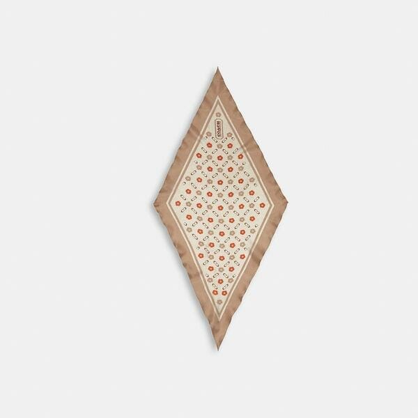 Description: Crafted of lightweight silk, this diamond scarf features a mashup of our Signature and prairie-inspired Tea Rose motif in a bold geometric pattern. Finished with a solid border and our Coach Badge, wear it around your neck or tie it on a bag for a pop of color.