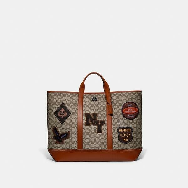 Toby Turnlock Tote In Signature Textile Jacquard With Varsity Patches