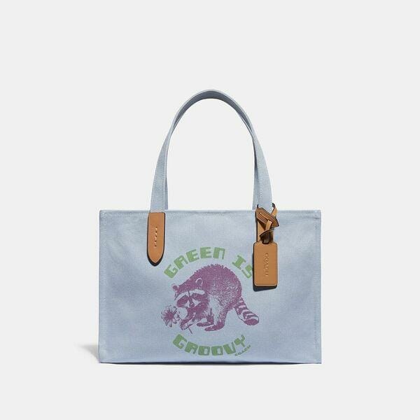 Recycled canvas and recycled leather. Snap closure. Handles with 18cm drop. 30.5cm (L) x 22cm (H) x 14cm (W). Coach Forever Collection.