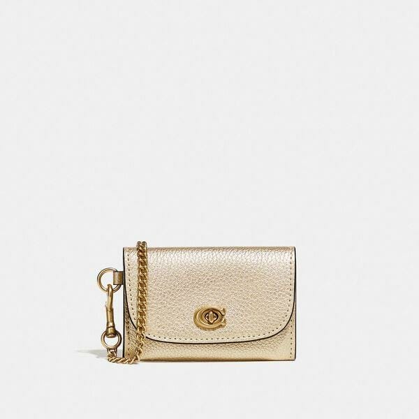 Description: Metallic polished pebble leather. One credit card slot. Turnlock closure, fabric lining. Outsides slip pocket. Detachable chain wrist strap. 10cm (L) x 6.5cm (H) x 1cm (W).