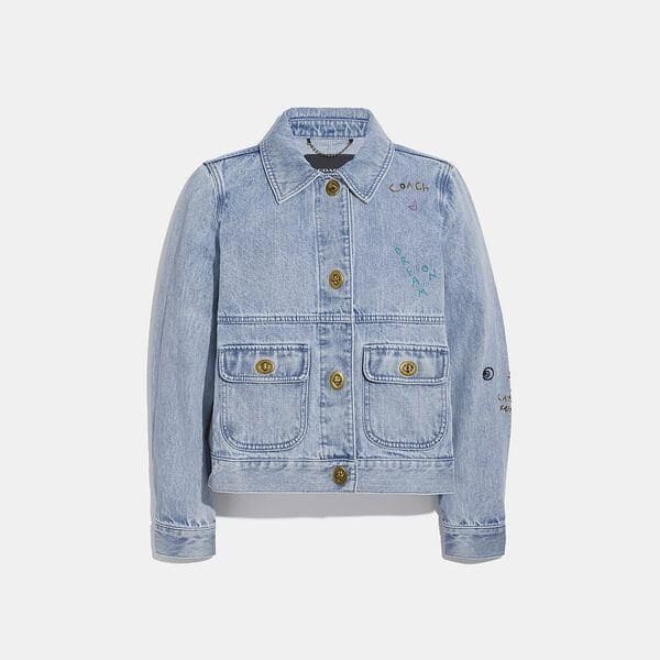 Description: Redefine the blues, this washed cotton denim jacket features our iconic turnlock hardware for a heritage touch. Colorfully embroidered with playful symbols, sayings and Coach icons, this classic fit silhouette is detailed with patch pockets and distinctive topstitching.
