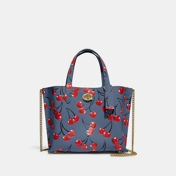 Description: Not too big, not too small, Willow is the perfect carry-it-all tote with space for all your day-to-day essentials. Crafted of polished pebble leather printed with a cheerful cherry motif, the compact style features two open pockets, a secure center zip compartment and sturdy top handles. Finished with our iconic turnlock closure, attach the detachable strap for shoulder or crossbody wear.