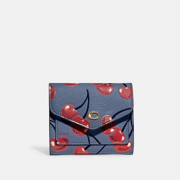 Description: Crafted of polished pebble leather featuring a cheerful cherry print, our Wyn Small Wallet invites organization with an elegant envelope design. Detailed with our Signature hardware, the tri-fold style opens to reveal seven card slots and a full-length bill compartment.