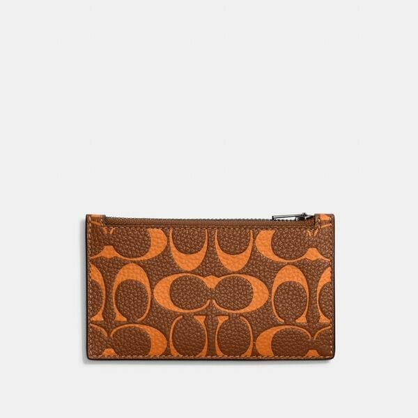 Description: Featuring a bold color combo, this Signature polished pebble leather case unzips to reveal an expandable pocket. A slim design that slips easily into pockets, it holds five cards and other small essentials.