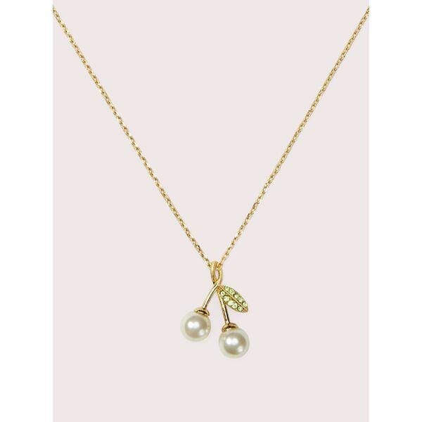 Description: cherries for you, our chérie? this charming pendant necklace has two, detailed with glass pearls and green czech stones at the leaves…