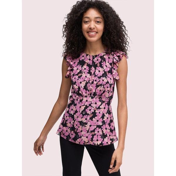 Description: in our world, flowers are always in bloom. see: the graphic pink blossoms on this black chiffon shell. look closely and you’ll find we wove it with metallic pink fil coupé dots throughout. (in case it wasn’t radiant enough.) we finished it with flutter sleeves and a gathered smocked front to add to the femininity of this piece.