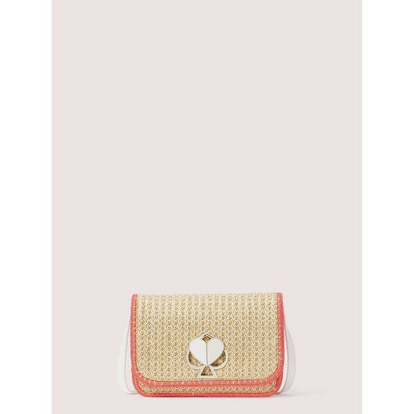 Description: our nicola twistlock medium shoulder bag is reimagined for summer in raffia with pops of colorful pebbled leather. true to the original handbag of the same name, its strong silhouette is balanced with soft, feminine details like rounded corners and refined jewelry-like hardware.