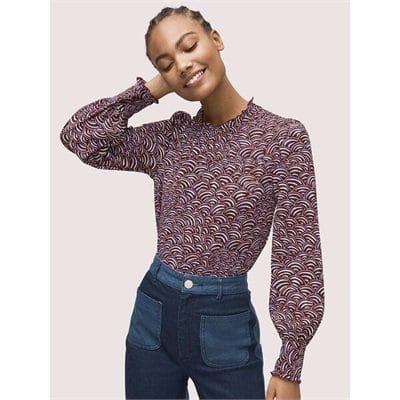 Description: our party bubbles print brings the fun wherever it goes–like how it adds a playful touch to this crepe blouse. we finished it with ruffled edges for a feminine touch.
