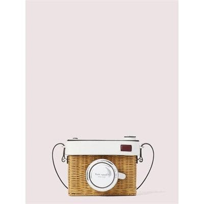 Description: when we made our rose camera bag, we took the name literally. the boxy wicker silhouette is accented with leather and silver patent leather details to resemble a vintage camera. want to know a secret? the logo-embossed lens cap snaps open to reveal a hidden pocket–perfect for fitting those extra special items (or your stash of gummy bears).