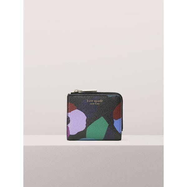 Description: our spencer small bifold wallter gets a whimsical spin for fall in durable faux leather printed with our vibrant floral collage motif. of course, we made this wallet as functional as it is beautiful: unsnapping it reveals that the spade flower jacquard-lined interior is filled with plenty of slots, slip pockets and zipper pockets for your current and growing card and receipt collection.