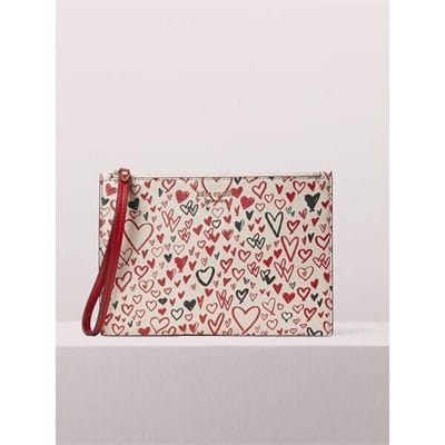 Description: our spencer small wristlet gets a playful spin in durable faux leather printed with red and black scribbly hearts. of course, we made this compact style as functional as it is beautiful: unzipping it reveals a surprising amount of room for your cash, cards, phone, lip balm, receipts, gummies…